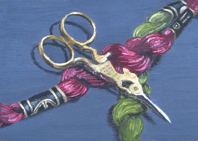 Rabbit Scissors with Embroidery Thread, March 2013 (oil on woodblock)
