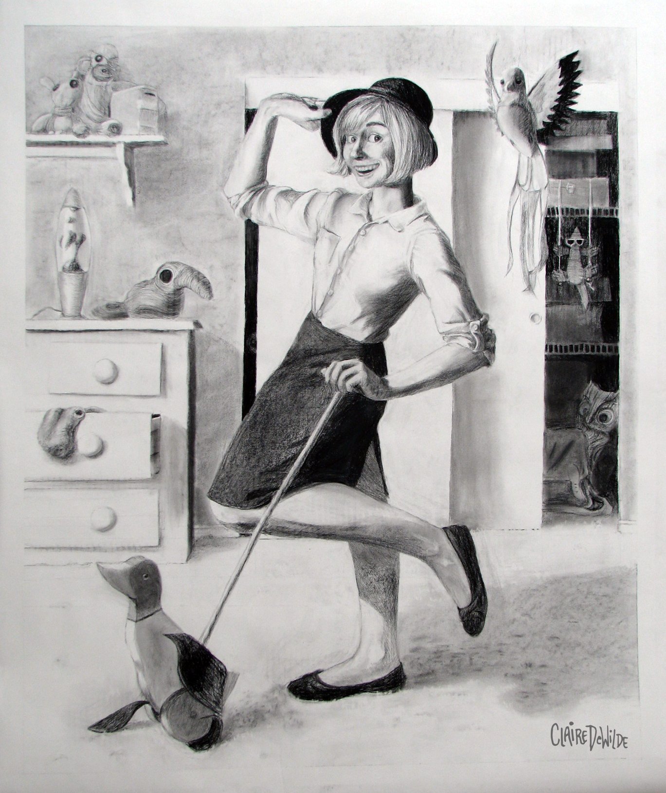 Overall, I’m very happy with the outcome of this project. It was a lot of fun to work on and it was very well received by the class. I set out to put a silly and original spin on a traditionally serious and dreary assignment, and I think I accomplished that. There is a minor issue with proportion (kudos if you can spot it!), which I think is partly because I had to stand so close to the mirror. I didn’t originally intend to include so many birds in the composition, but once the rolling duck and the quetzal (hanging from the ceiling) established a pattern, I ran with it. I never realized how many bird-related objects I owned prior to this drawing!